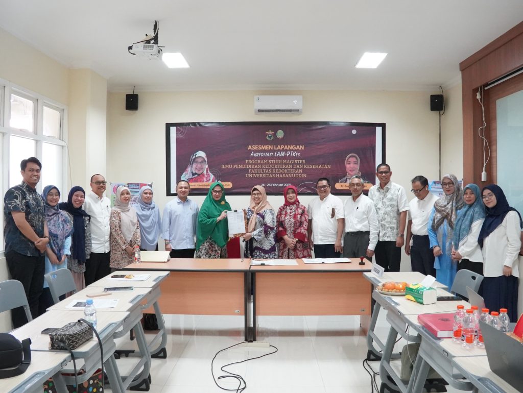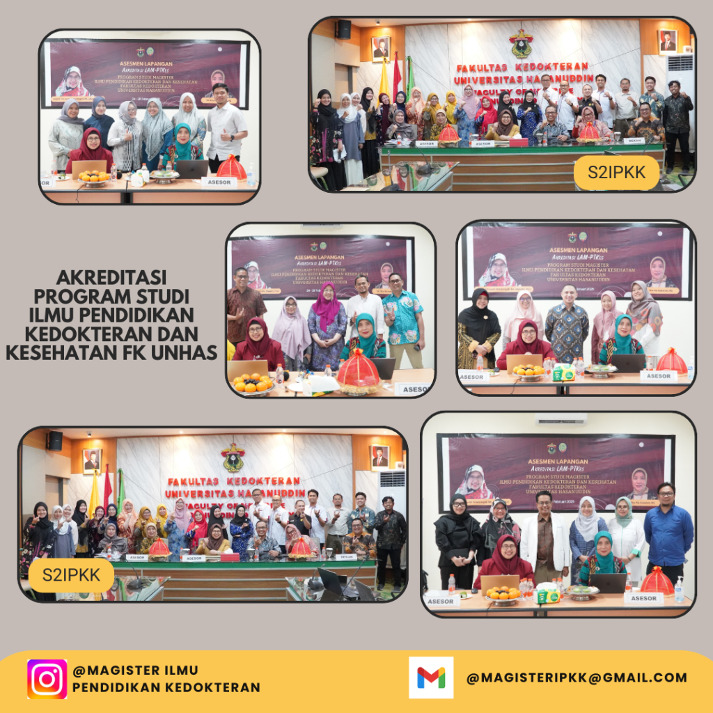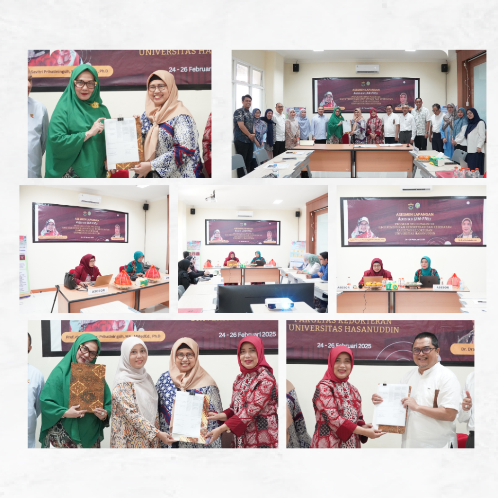 Program Studi Ilmu Pendidikan Kedokteran dan Kesehatan Fakultas Kedokteran Universitas Hasanuddin menggelar Assesmen Lapangan Akreditasi Akreditasi LAM PT-Kes pada tanggal 24 – 26 Februari 2025. Kegiatan ini berlangsung dengan lancar, Akreditasi yang dilakukan dihadiri oleh Tim Asesor yaitu Prof. dr. Titi Savitri Prihatiningsih, MA.,MMedEd , Ph.D dan Dr. DRA. Ria Kodariah, MS, Akreditasi ini dilaksanakan bertujuan untuk meningkatkan Kualitas Program Studi